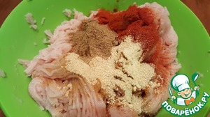 Добавляем соевый соус и специи. Вымешиваем фарш. Добавляем сухое молоко. Я добавила 50 мл холодной воды для сочности, думаю можно добавить чуть больше.