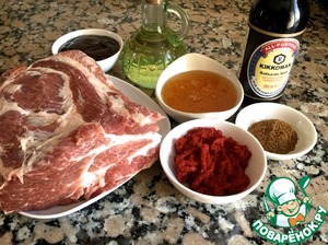 2. Для маринада смешать мёд, томатную пасту, соус хойсин, соевый соус и растительное масло. Залить свинину 2/3 маринада, оставшийся маринад убрать для глазировки мяса.