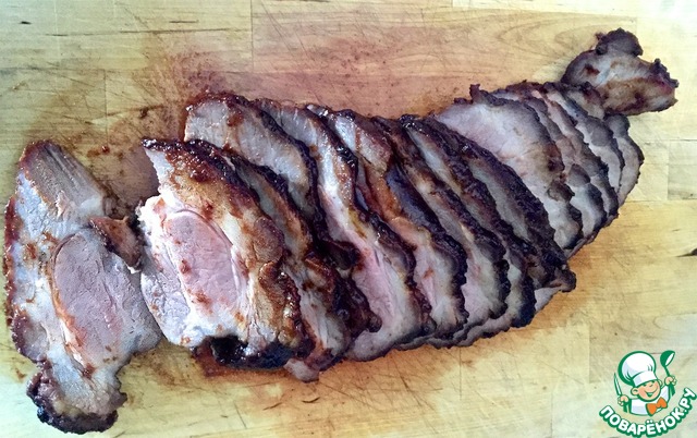 4. Разогреть духовку до 200 С. Проложить глубокий противень фольгой, установить в него решётку (Расстояние между дном противня и решёткой должно быть около сантиметра. Если у вас нет специального противня, положите несколько кусочков на дно противня, а сверху установите любую решётку, на которой поместится мясо). Влить в противень примерно 200 мл холодной воды (мясо на решетке не должно касаться воды). Выложить маринованную свинину на решетку и запекать 23 минуты. Затем достать мясо и смазать его оставшимся маринадом. Запекать еще 23 минуты, после чего снизить температуру до 180С и запекать еще 20 минут.