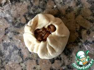 11. Плотно защипнуть верх и выложить на присыпанную мукой доску. Повторить с оставшимся тестом и начинкой.