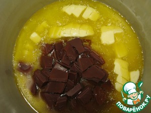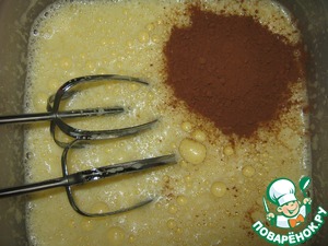 Яйца взбить с сахаром, добавить к ним порошок какао, и масляно-шоколадную смесь. Всё вымешать.