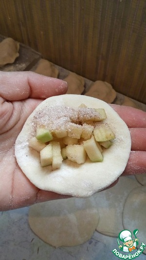 Тесто разделываем, раскатываем не очень тонко. На каждую лепешку кладем немного яблок, посыпаем по вкусу сахаром с корицей. Формируем вареники.