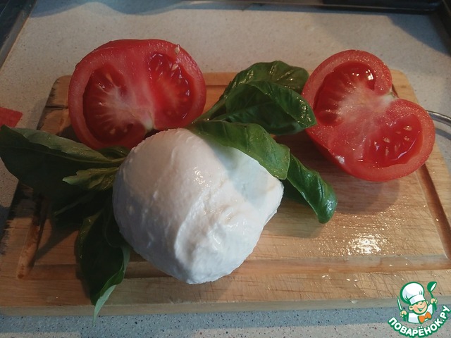 Нарезаем моцареллу, помидор, подготавливаем листочки базилика