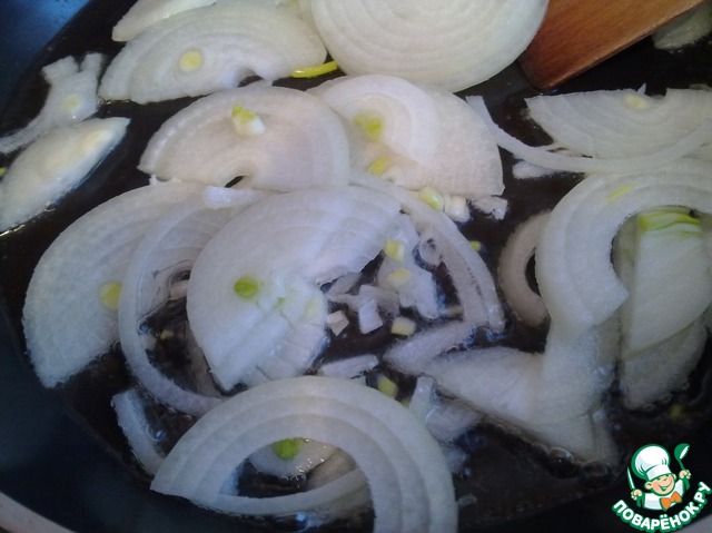 Нарезаем лук полукольцами и выкладываем в разогретое в сковороде сливочное масло, помешивая, на среднем огне обжариваем до легкого румянца. -