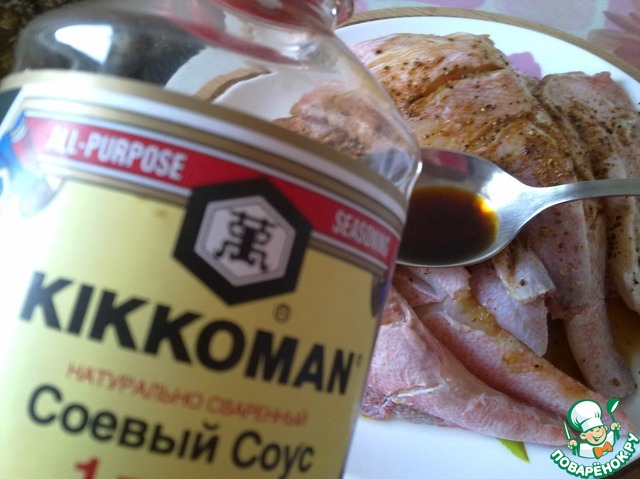 Приправляем с обеих сторон смесью перцев и соевым соусом "Kikkoman". -