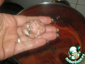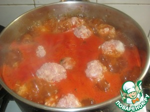 Развести томатную пасту водой и, сформировав тефтельки, опускаем их в кипящую жидкость