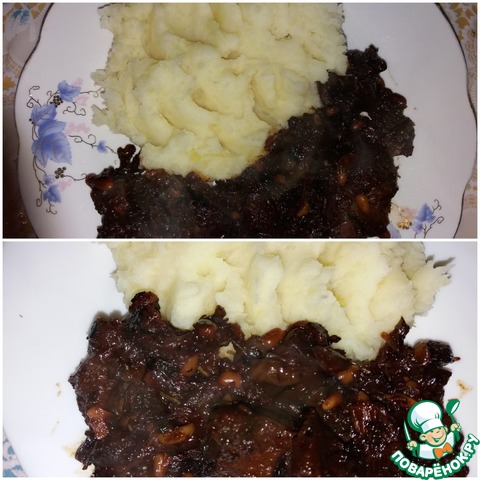 Подавать можно с любым гарниром, у меня было пюре из картофеля, репы и сельдерея. При подаче можно украсить веточкой кинзы, не совсем по-сибирски, зато красиво!