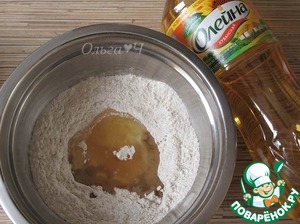 Смешать оба вида муки, добавить растительное масло и мятный сироп, перемешать.
