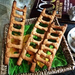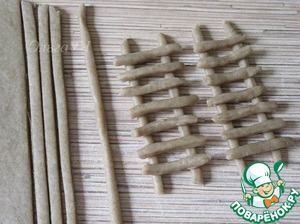 Тесто раскатать, нарезать тонкими полосками. Каждую полоску скатать в жгутик. Нарезать по 2 "столбика" и по 7 "перекладин" для одной "лесенки". Всего у меня получилось 8 "лесенок". Места соединения "столбиков" и "перекладин" можно смазывать водой для лучшего сцепления.