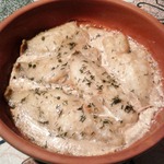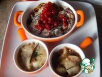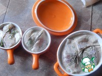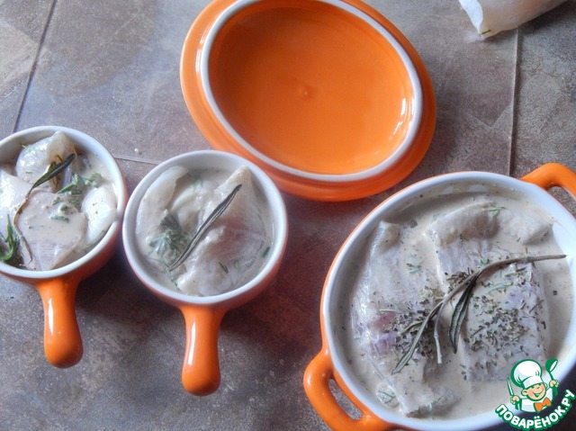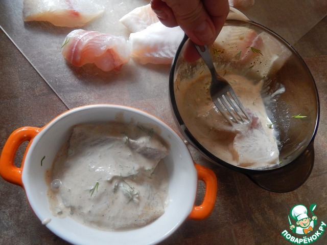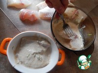 Нарезаем филе на кусочки и обмакивая в смесь, выкладываем в керамическую посуду для запекания |