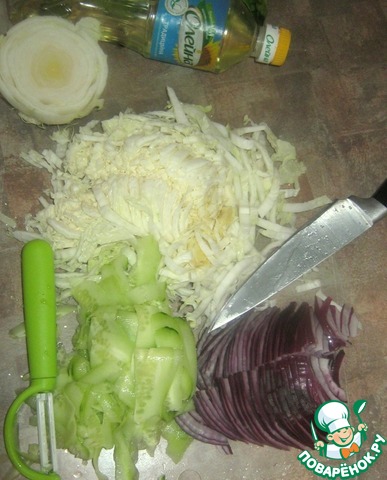 Пекинскую капусту и лук мелко нарезать, огурец я нарезала слайсами (не длинными-по косой)