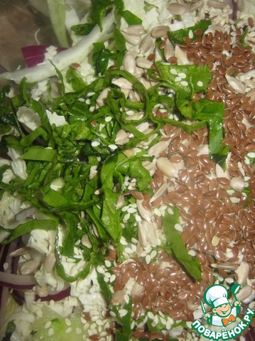 Соединить овощи и семена льна, кунжута и подсолнечника