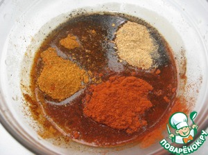 Процеженный маринад соединить с куркумой, паприкой, имбирём и приправами для курицы