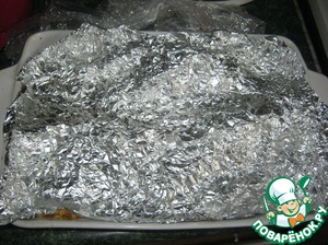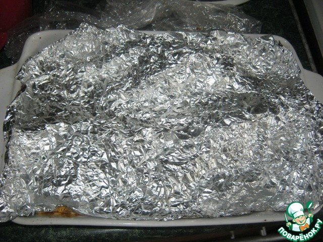Укрыть фольгой. выпекать при температуре 180 градусов полчаса. потом снять фольгу и ещё минут 15 периодически смазывая маринадом голени