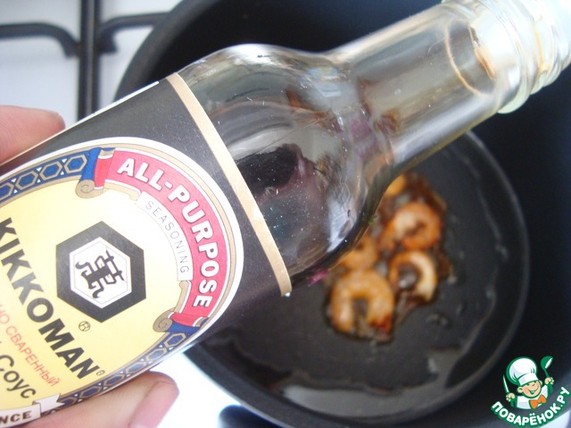Чеснок убираем, выкладываем очищенные креветки, обжариваем быстро и наливаем соевый соус. Перемешиваем и снимаем с огня.