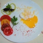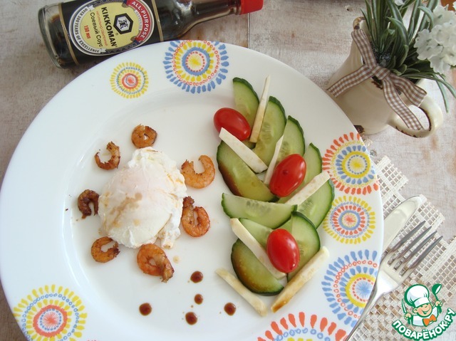 Это мой завтрак. Яйцо-пашот с креветками в соевом соусе и с салатом.