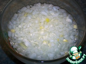 Лук мелко нарезать, выложить в тарелочку. Добавить к луку уксус и долить водой, чтоб покрыть лук.
