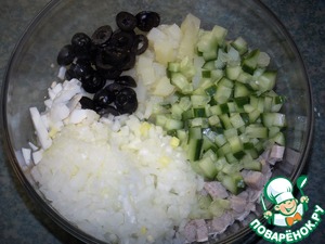 Лук слить, маслины порезать колечками. Огурец порезать кубиком. Все перемешать, добавить соль и перец, заправить майонезом.