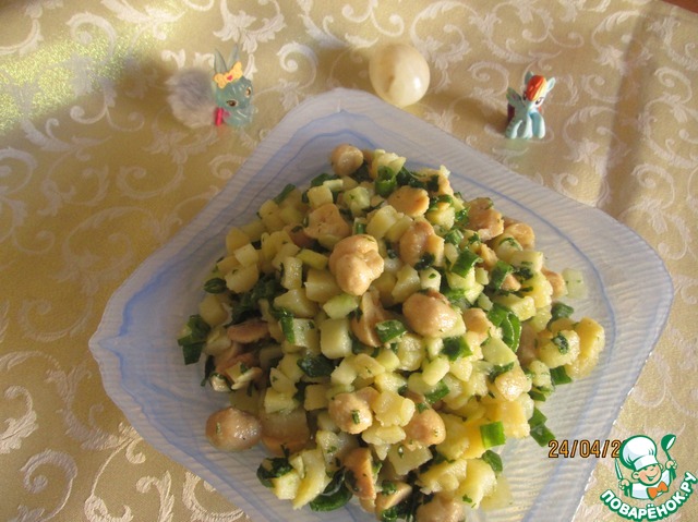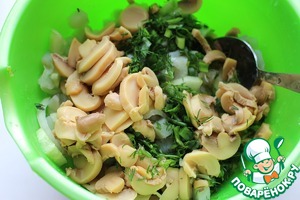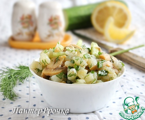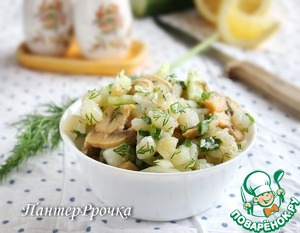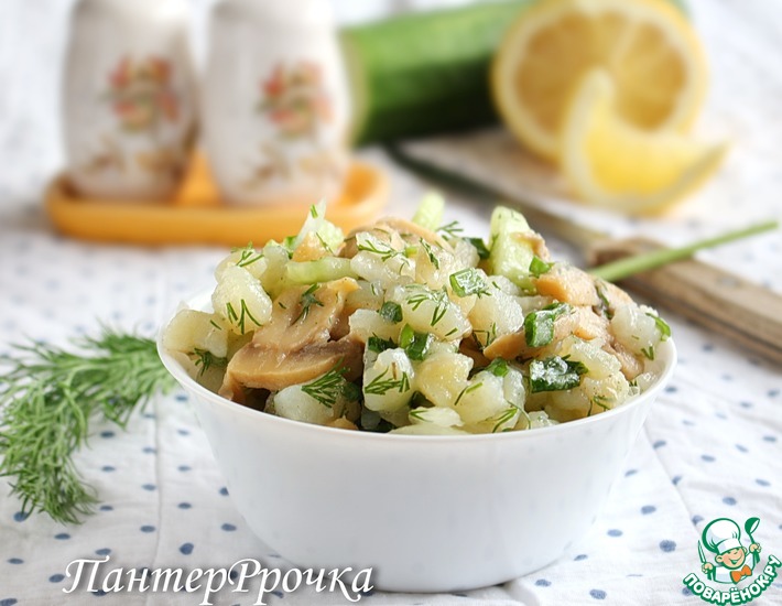 Смешать картофель, лук и огурец. Добавить измельченную зелень и шампиньоны (к сожалению, свежих грибов я не нашла, поэтому добавила нарезанные консервированные). Если берете свежие шампиньоны, то их надо почистить, протереть влажной тряпочкой и нарезать небольшими дольками.