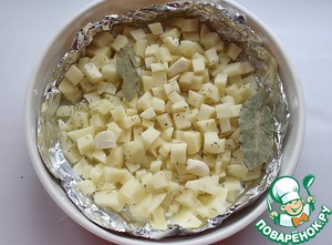 Картофель почистить и нарезать небольшими кубиками. Посолить, добавить розмарин, лавровый лист и нарезанный пластинами чеснок. Готовить на пару в течение 15 минут до готовности. (Картофель также можно отварить обычным способом с добавлением указанных специй, а потом нарезать.)