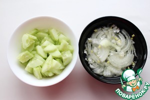 Лук нарезать тонкими полукольцами. Огурец очистить от кожуры и нарезать небольшими ломтиками.