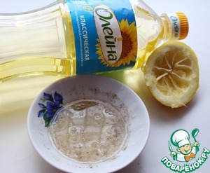 Сделать заправку: смешать лимонный сок, мед, уксус, перец и подсолнечное масло.