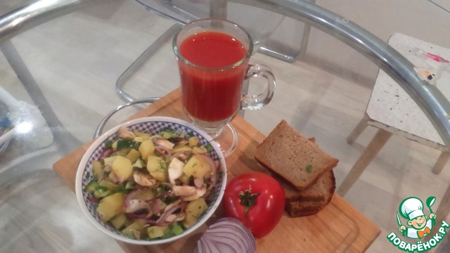 Уж сколько картофельных салатов на сайте, но я все же поделюсь и своим. В моем варианте картофель готовится с добавлением розмарина, лаврушки и чеснока, что придает ему неповторимую нотку. Свежий огурец дает свежесть, а шампиньоны - нежность. А ароматная заправка делает блюдо поистине бесподобным! Салат вкусен как в теплом, так и в холодном виде.