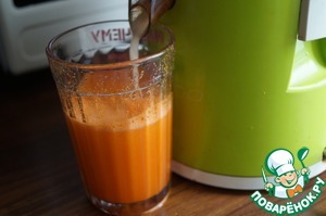 При помощи соковыжималки из моркови и лука выжать сок, должно получиться 1.5 стакана. К луково-морковному соку добавить 0.5 стакана томатного сока, чтобы общее количество сока было 2 стакана.