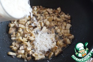 В масле обжарить шампиньоны и добавить к ним стакан риса. Прокалить рис в масле с шампиньонами 3-4 минуты.