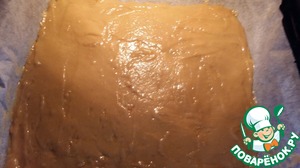 Противень застелить бумагой для выпечки. Я, на всякий случай, смазала ее сливочным маслом. Выложить тесто тонким слоем и разровнять его лопаткой.