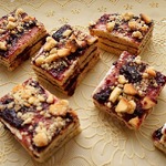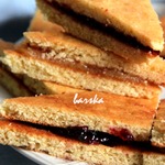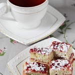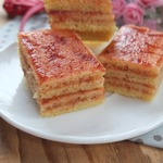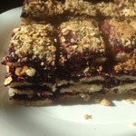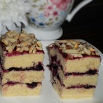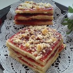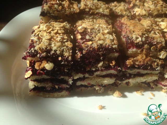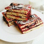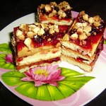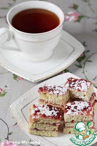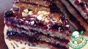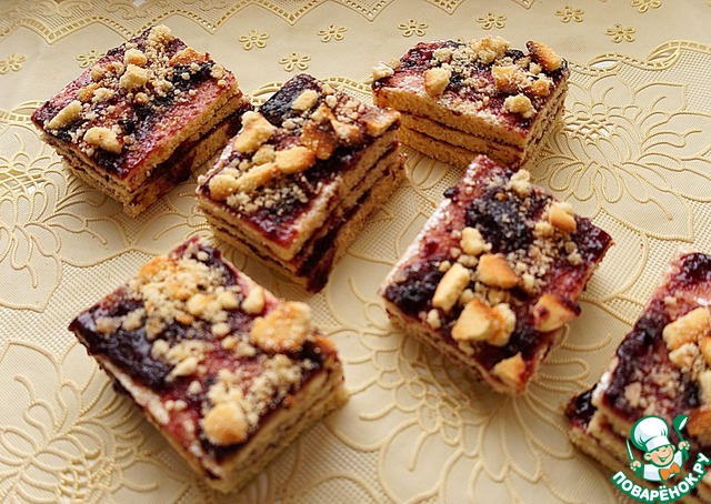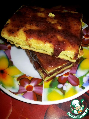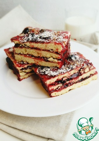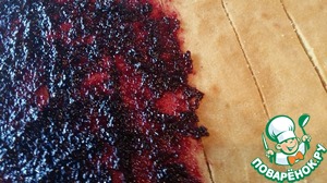 Выпекать в заранее разогретой до 200 градусов духовке около 10 минут. Не пересушить, а то корж затвердеет. Разрезать корж на 6 одинаковых лент и сверху промазать черносмородиновым джемом.