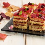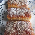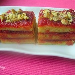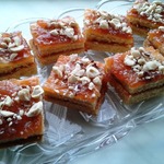Сложить в 2 стопки по 3 пластины. Сверху присыпать сахарной пудрой, а также обжаренными и нарубленными миндальными орехами. Порезать на порционные кусочки.