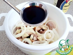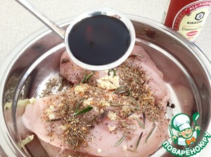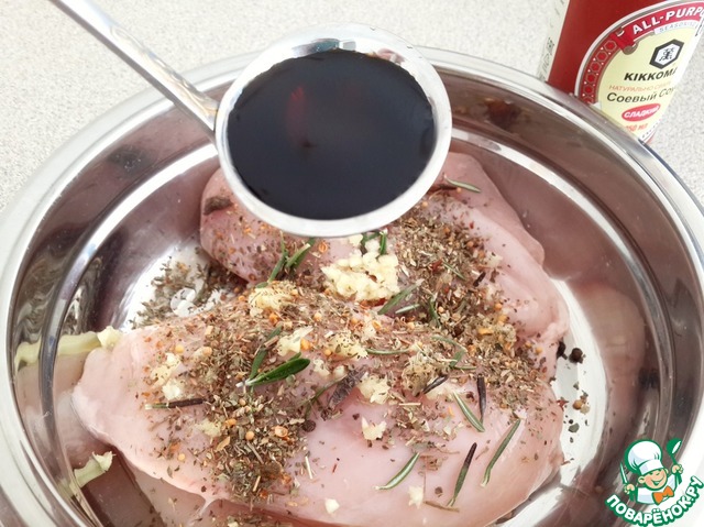 • Смешать филе со специями, измельченным чесноком, добавить сладкий соевый соус Kikkoman. (он придаст невероятно вкусный, сладковатый вкус блюду)
