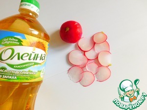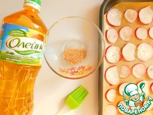 Выкладываем редис в один слой на подготовленный противень. Верх каждого ломтика смазываем подсолнечным маслом ТМ Олейна и присыпаем смесью приправ по вкусу. Ставим противень в духовку на 5-10 минут. В течении всего времени приготовления ВНИМАТЕЛЬНО следим, что бы редис не сгорел!!! -
