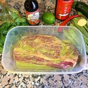 1. Выжать сок из лаймов и смешать с пастой васаби. Смазать получившейся смесью мясо и оставить мариноваться на ночь.