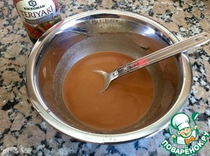 2. Слить маринад с мяса и растворить в нем крахмал. При необходимости добавить немного воды. Влить в получившуюся смесь соус Терияки, вино, добавить томатную пасту и хорошо размешать. Это будет соус для заливки.