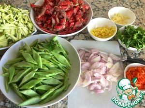 3. Чеснок и имбирь очистить и мелко порубить. Зелёную фасоль порезать небольшими кусочками, мясо – соломкой, шалот – полукольцами, цуккини – тонкой соломкой, чили – тонкими кольцами, кинзу разобрать на листики.