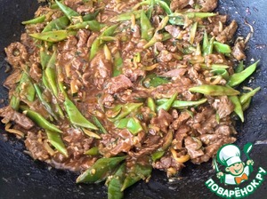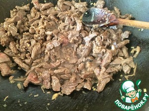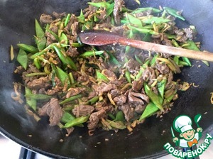 4. В воке разогреть масло. Добавить мясо, обжарить, помешивая, 2 минуты и убрать на отдельную тарелку.