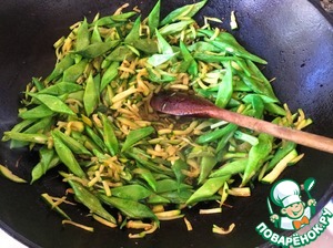 5. Добавить в вок масла при необходимости и обжарить имбирь 30 секунд. Затем добавить цуккини и фасоль и обжарить 2 минуты. Добавить чеснок и перец чили и готовить еще 30 секунд. Всё должно постоянно размешиваться.
