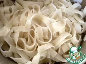 8. Рисовую лапшу залить кипятком, подержать несколько минут и слить воду (или готовить по инструкции на пакете). Влить ложку кунжутного масла, добавить соль и размешать.