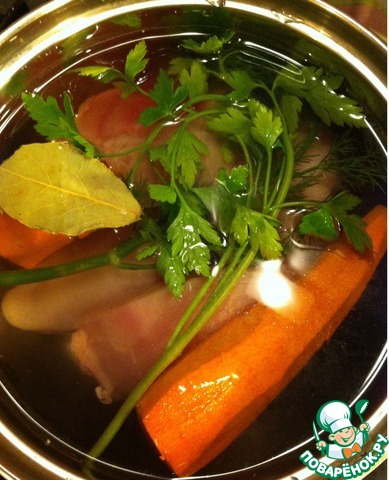 Грудку отварить в подсоленной воде вместе с морковью, укропом, петрушкой и лавровым листом.