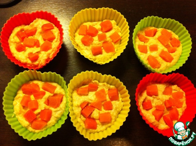 Формочки заполнить на половину мясным муссом, уложить кусочки моркови.