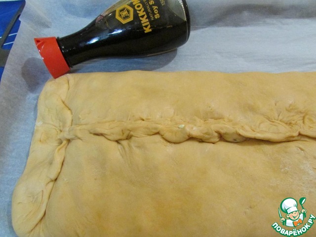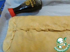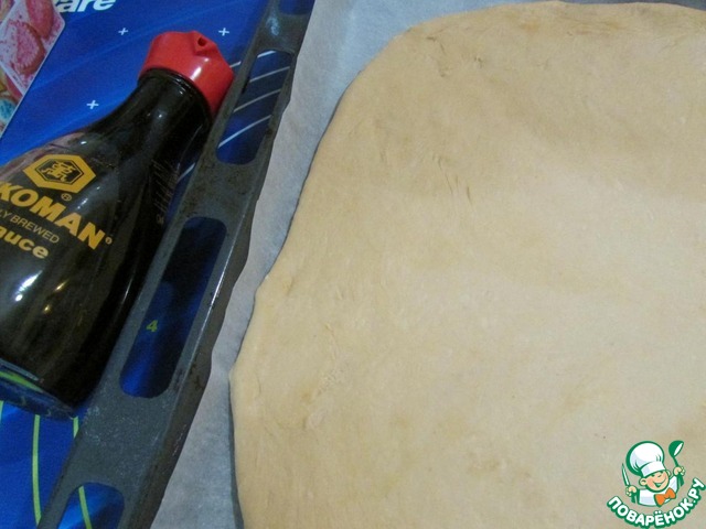 Тесто раскатать, выложить на противень, застеленный пекарской бумагой. Толщина коржа должна быть, около 5 мм.