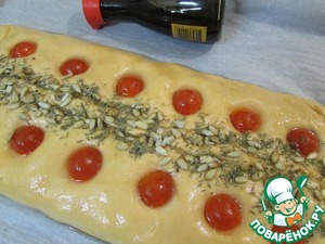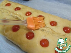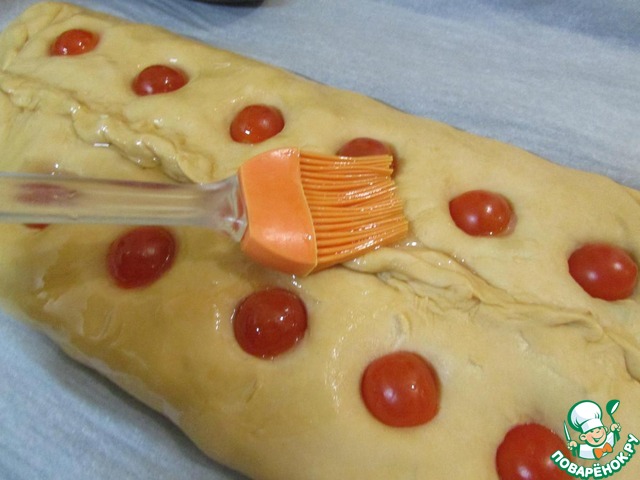 На верху в пироге пальцем проделать дырочки. Черри разрезать на половинки. Выложить половинки в дырочки разрезом вниз. Верх пирога смазать растительным маслом.
