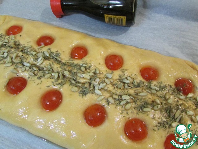 Посыпать пирог по шву семенами подсолнечника и тимьяном. Отправить в разогретую духовку (180 градусов). Выпекать 35-40 минут. Готовый пирог извлечь из духовки. Дать остыть.