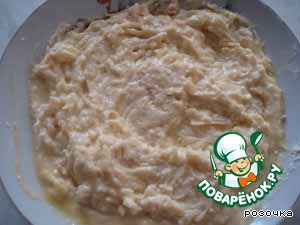 Яйца взбить с сахаром (количество сахара - по вкусу). Добавить творог и хорошо размешать.