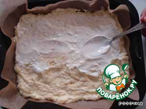 Выложить массу в форму, сверху помазать сметаной и в духовку.