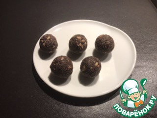 Из получившейся массы формируем шарики-конфеты. У меня получилось 18 конфет массой 15-18 грамм. Конфеты прекрасно лепятся и не разваливаются, дополнительно охлаждать в холодильнике их не нужно!