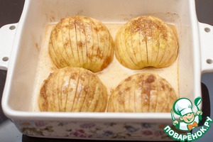 Форму слегка смазываем маслом, кладем в нее яблоки и очень тщательно смазываем их соусом, стараясь, чтобы он попал и в надрезы. Накрываем форму фольгой и отправляем в духовку на 20 минут