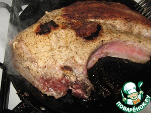 Свиной биток на кости с прослойками жира посолить, натереть специями, смазать растительным маслом.